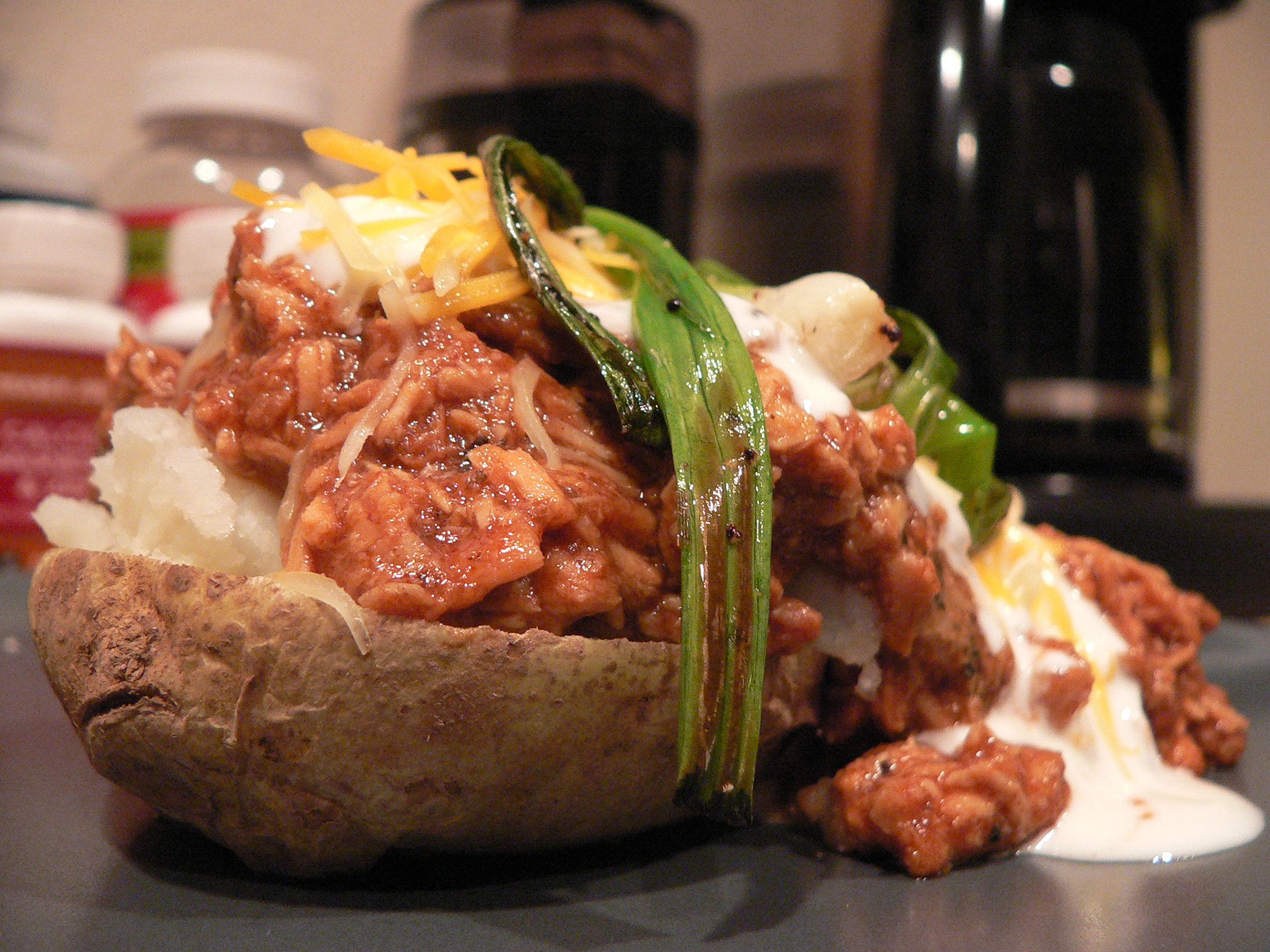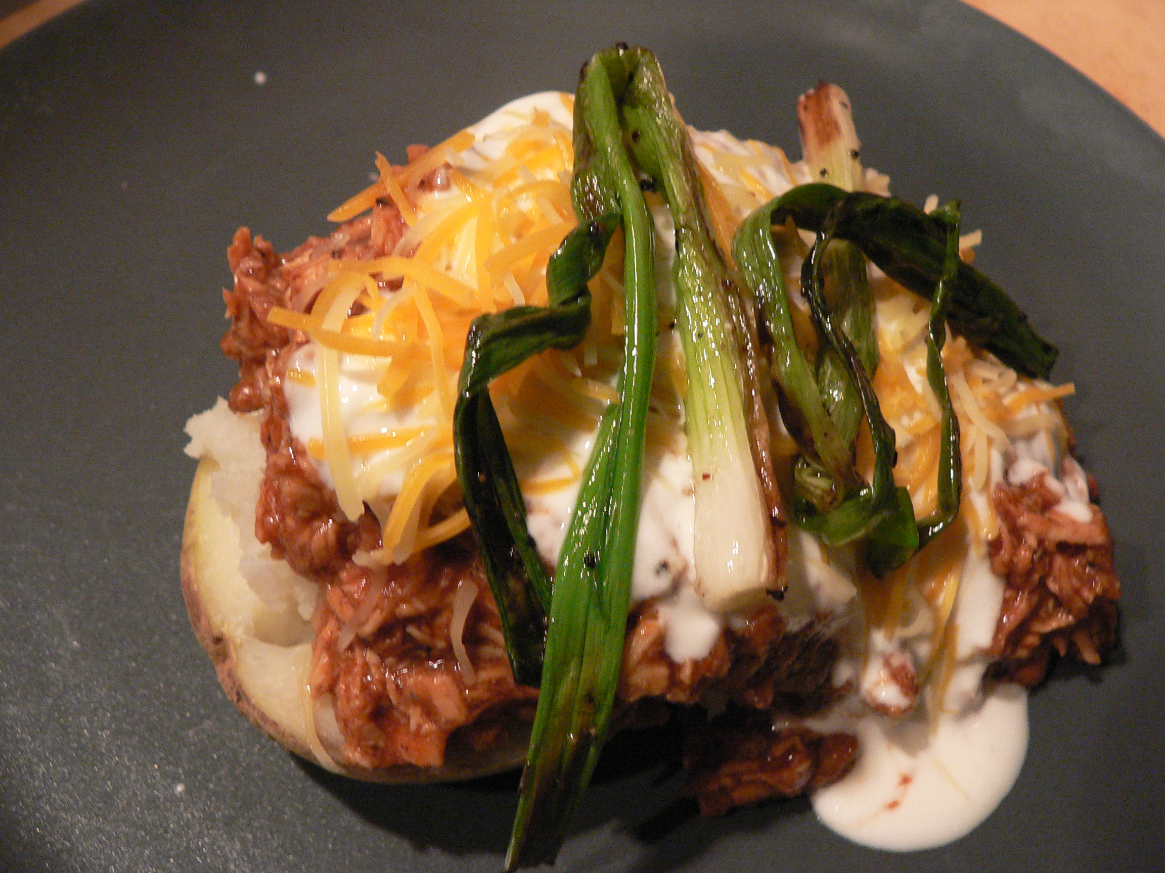 I microwave the potato (puncture with a fork in a few places first) for about 10 minutes. If you are using seared green onions, do that wile the potatoes cook. Otherwise, dice your onions. Once the potatoes are cooked, cut lengthwise and fluff a little bit. Then microwave the chicken for 2 minutes per the instructions. Stir and then 30 seconds more. Top the potato with a decent serving of bbq chicken, yogurt or sour cream, cheese and green onion. Pretty damn easy!