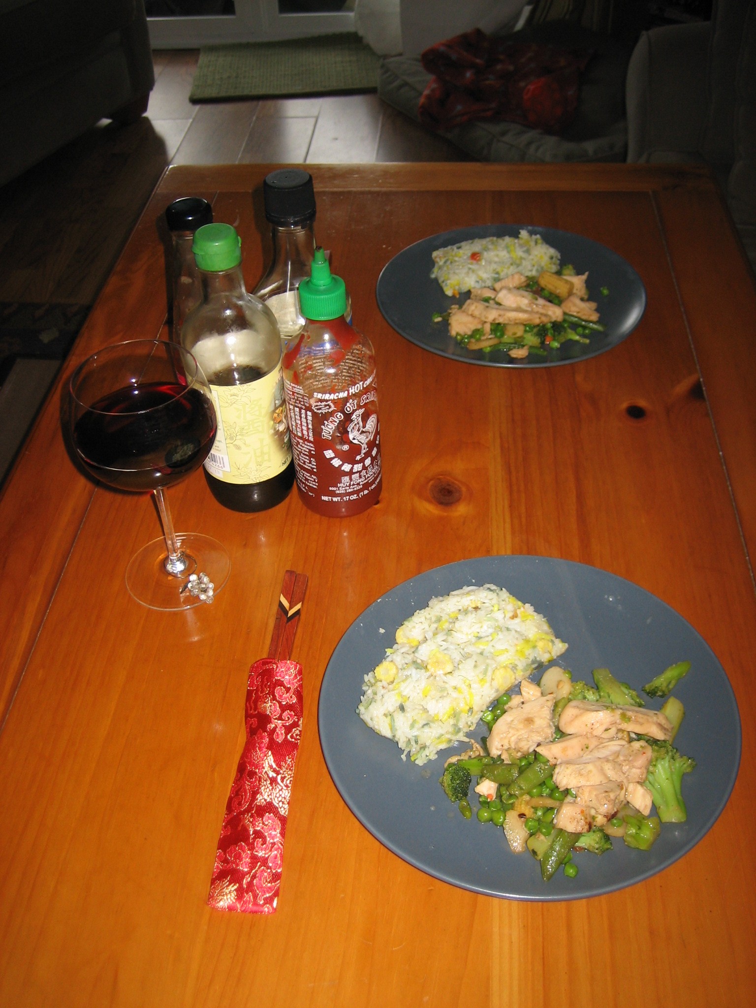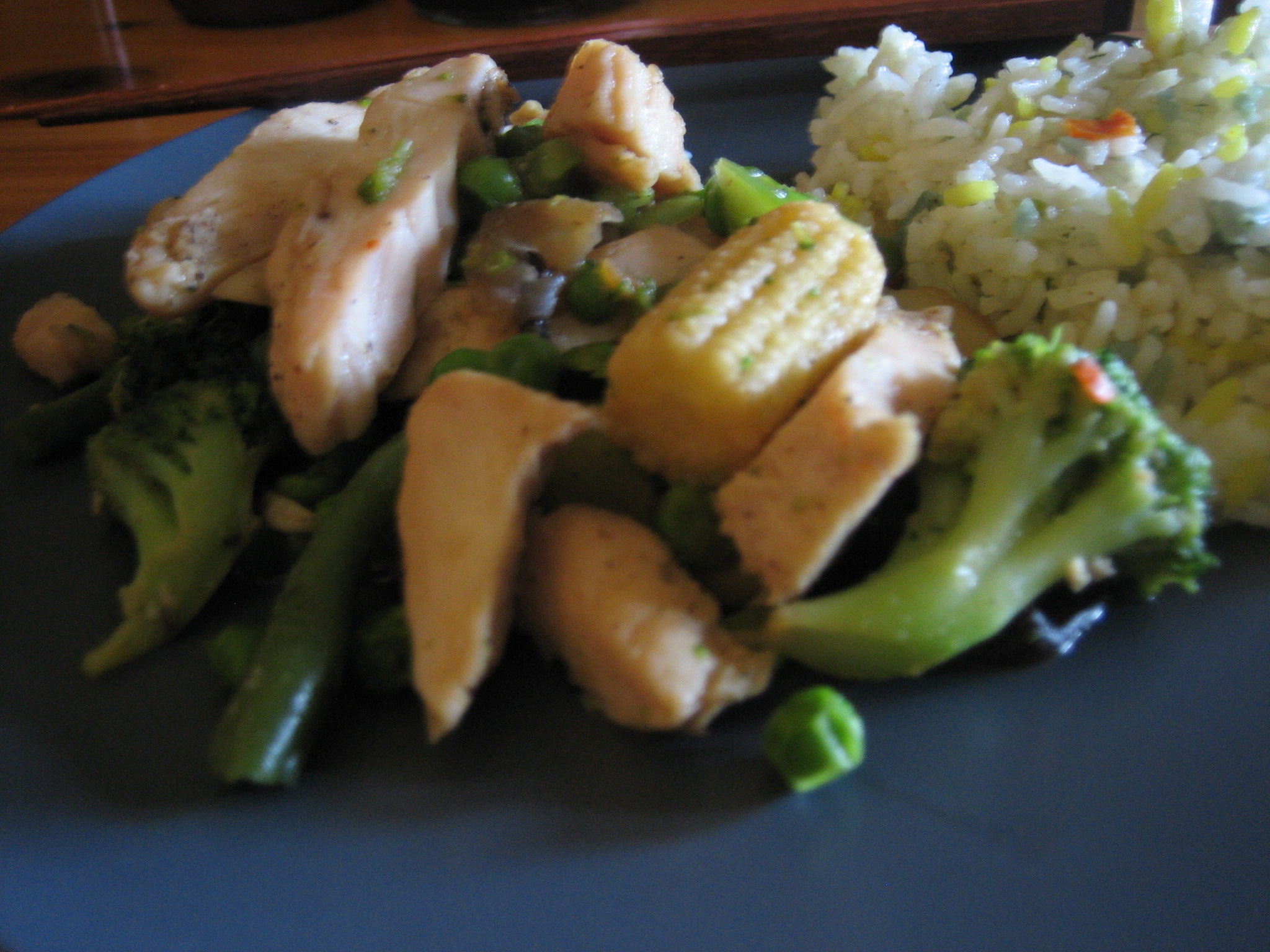cook for a couple of minutes. As they start to cook and are still pretty firm, add the chicken for a minute or two. Add the gluten free soy sauce and chili sauce and mix to allow all of the flavors to blend. Stir fry to the done ness-you prefer. Plate your stir fry with some Confetti Rice for a quick, nutritious and delicious meal!